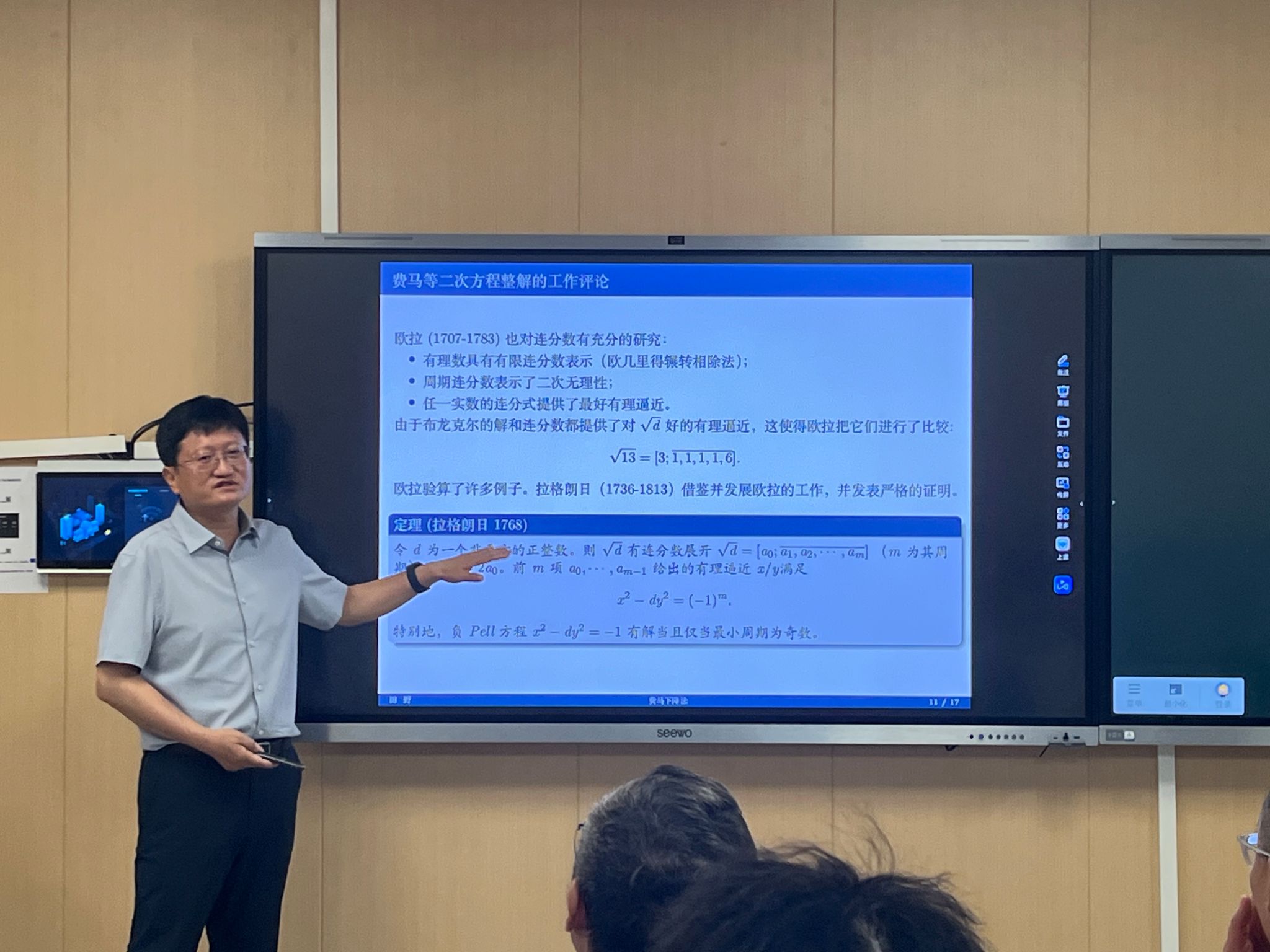 田野院士首先从费马的职业与费马大定理本身切入,全面阐述了费马在数论领域的贡献及思想传承;随后,以平方和、佩尔方程、同余数问题与椭圆曲线等数学问题为依托,深入介绍了费马下降法思想在这些经典数论问题中的深刻应用与贡献。报告内容丰富、深入浅出,全面展现了“费马下降法”及其思想在数论领域研究中的应用与影响。