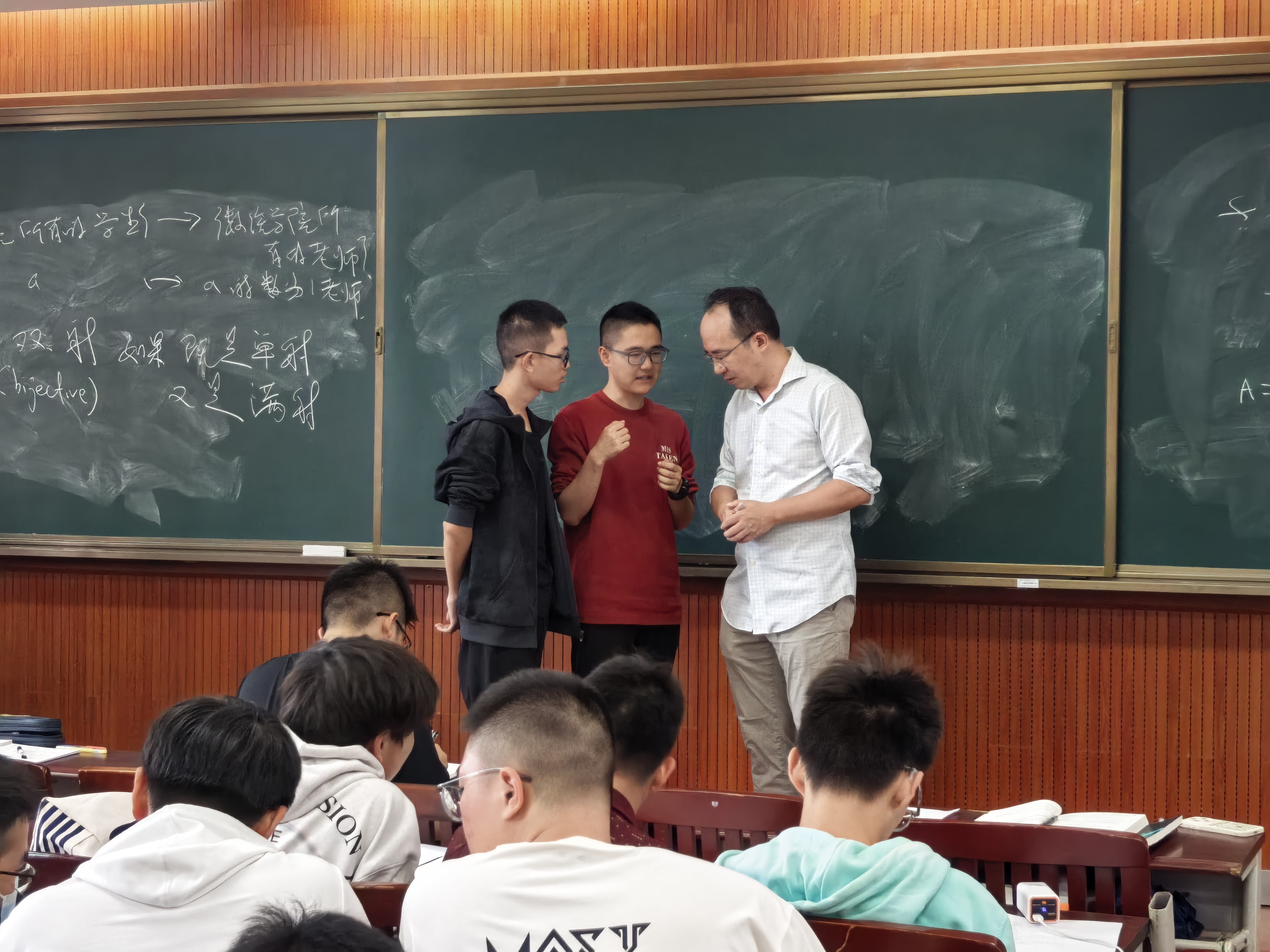 李寒峰的课堂,边界远不止于90分钟。课后答疑环节往往成为讨论更热烈、思维火花迸溅的“第二战场”。 刘育航分享了一次难忘的经历:“我向李教授请教问题后,他拉着我在黑板前反复推导,一遍又一遍地阐释,同学们也围拢过来讨论,那种专注和热烈,感觉比上课时氛围还要浓厚!”这种课后互动构建了新型师生关系,打破了传统课堂的界限。在这门横跨3学期、累计248学时的《数学分析》课上,师生共同谱写的思维交响曲,远比单向的独奏更为深邃动人。