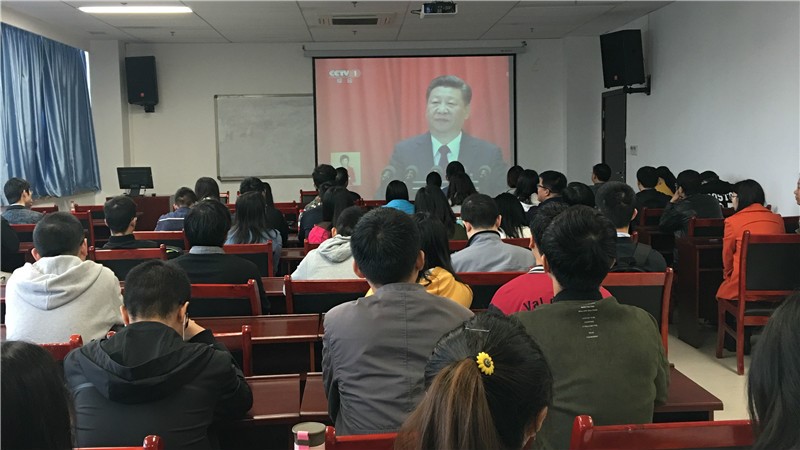 党委组织学院全体师生党员于理科楼LD402室集中观看开幕会直播。
